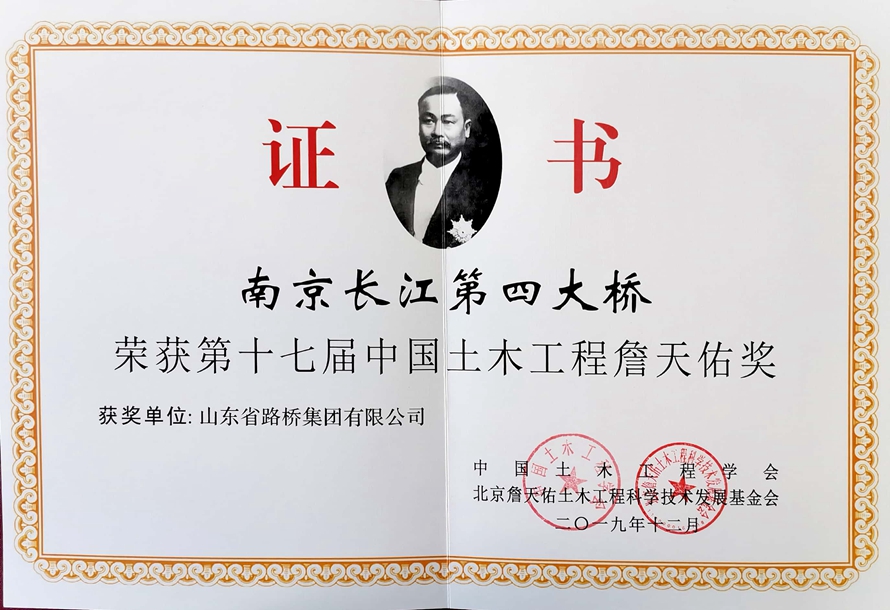 9月22日,在中國(guó)土木工程學(xué)會(huì)2020年學(xué)術(shù)年會(huì)暨第十七屆中國(guó)土木工程詹天佑獎(jiǎng)?lì)C獎(jiǎng)大會(huì)上,山東路橋參建的南京長(zhǎng)江第四大橋喜獲詹天佑獎(jiǎng),這是山東路橋第二次獲此殊榮。