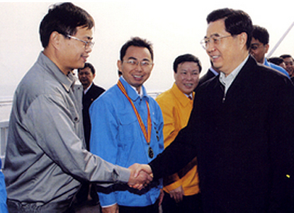 原中共中央總書記、國家主席、中央軍委主席胡錦濤2005年10月視察南京長江三橋建設(shè)并親切接見集團公司干部職工。